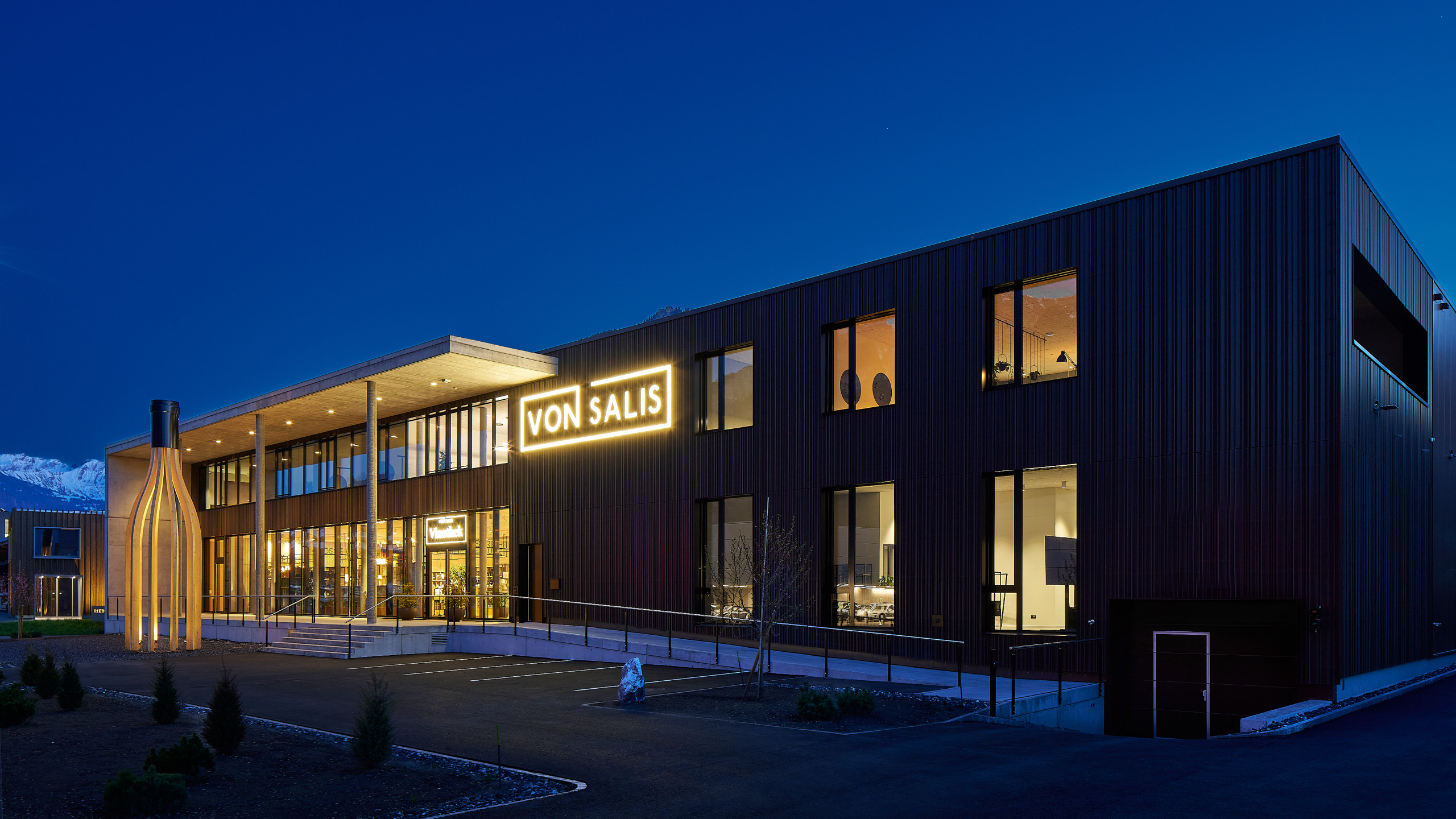Seit dem Frühling 2025 befindet sich von Salis an einem neuen, modernen Standort in Maienfeld. Mitten in der Bündner Herrschaft vereint der neue Hauptsitz Lager, Betriebsgebäude und eine Vinothek, die als eine der schönsten der Schweiz gilt. Die stilvolle, lichtdurchflutete Vinothek lädt zum Entdecken, Degustieren und Verweilen ein – ein Ort, an dem Wein erlebbar wird, ob aus Eigenproduktion, der Bündner Herrschaft oder den besten Weinregionen Europas.